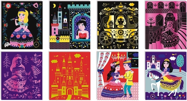 Dieses elegante Kratzkarten-Set verwandelt jeden Strich mit dem Holz-Stylus in ein bezauberndes Bild mit Prinzessinnen – vom Ball über den Ausritt bis hin zur Palasttreppe. Kinder kratzen die obere Schicht der Karten ab und enthüllen leuchtende Farben und funkelnde goldene Details, die vor ihren Augen zum Leben erwachen.