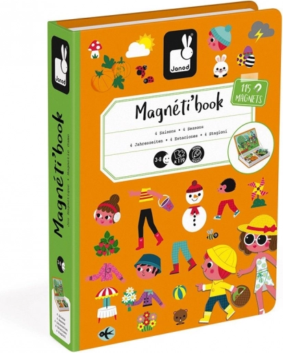 Das magnetische Buch Janod Magnetibook – Jahreszeiten fördert Fantasie, logisches Denken und Feinmotorik. Kinder legen anhand von Kärtchen Szenen der einzelnen Jahreszeiten und wählen die passenden Kleidungsstücke und Accessoires dazu aus. Dank des kompakten Buchformats ist es ideal für Reisen, Auto oder Besuche.