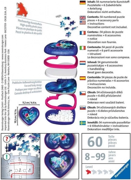 Gestalten Sie ein originelles 3D-Schmuckkästchen in Herzform mit einem zauberhaften Meerjungfrauenmotiv. Spezielle gekrümmte und flexible Teile greifen präzise ineinander und behalten dank der hochwertigen Ausführung aus robustem Kunststoff ihre Form – ganz ohne Kleben.