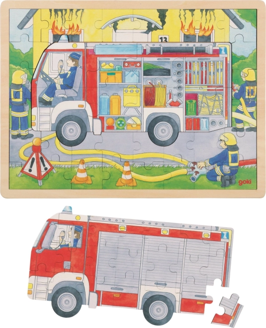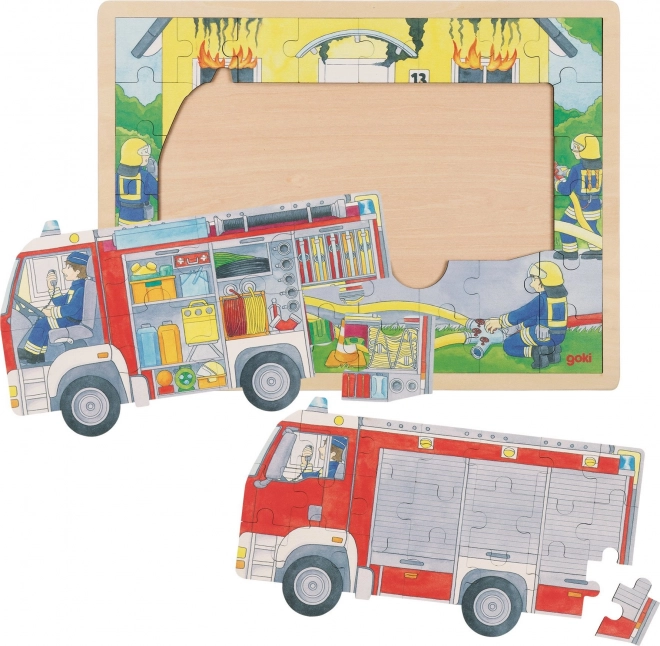 Dieses hochwertige Holzpuzzle der Marke GOKI zeigt eine realistische Einsatzszene der Feuerwehr in zwei Schichten. Dank der Grundplatte mit erhöhtem Rand lässt sich das Puzzle bequem zusammensetzen und einfach aufbewahren. Die Schichtbauweise ermöglicht Kindern einen Blick ins Innere des Feuerwehrfahrzeugs und vermittelt, welche Werkzeuge und Ausrüstung Feuerwehrleute verwenden.