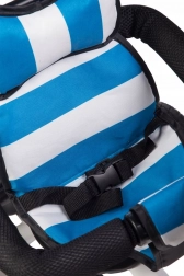 Sicherheitsgurte halten das Kind in der richtigen Position auf dem Sitz, und eine spezielle Abdeckung zwischen den Beinen verhindert ein Herunterrutschen. Wenn das Kind die Pedale nicht erreicht, kann es die Füße auf die klappbaren Fußstützen stellen, die sich zusammenklappen lassen, damit sie beim Treten nicht stören.