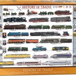 Puzzle mit Darstellungen der Entwicklung der Züge, z. B. Class 4000 - Big Boy, Class A4, Class 373, Class 91 und N700. Bei jeder Lokomotive sind ihre Bezeichnung, die Antriebsart, das Herkunftsland, das Eisenbahnunternehmen und das Baujahr angegeben. Bei einigen gibt es zusätzliche Angaben wie Länge oder Höchstgeschwindigkeit. An den Seiten befindet sich eine Zeitleiste der Eisenbahngeschichte mit drei Porträts (Richard Trevithick, George Stephenson, Robert Stephenson). Die Texte sind in englischer Sprache.