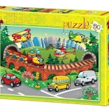 Bereiten Sie Kindern Freude mit einem farbenfrohen Puzzle zum Thema Verkehr. Das Bild mit Autos, Bussen und weiteren Fahrzeugen unterhält und fördert gleichzeitig ihre Fähigkeiten. Dank der 50 Teile ist das Zusammensetzen angemessen anspruchsvoll und eignet sich für kleine Einsteiger.