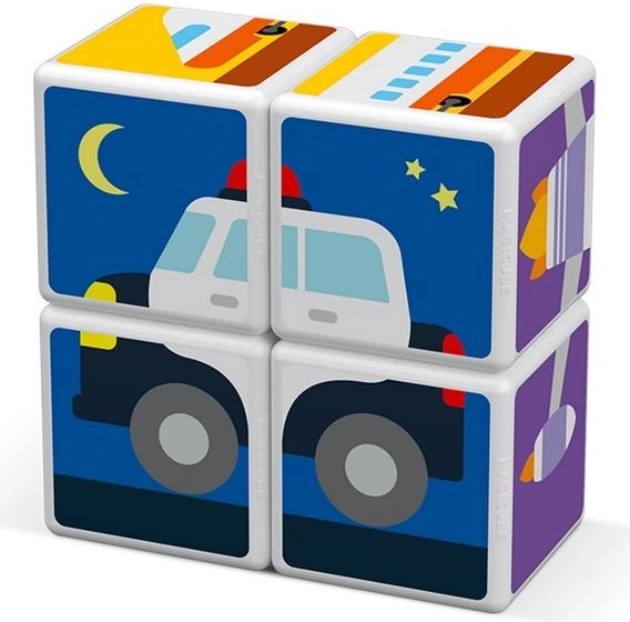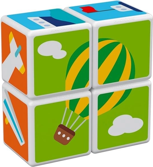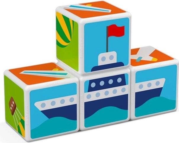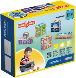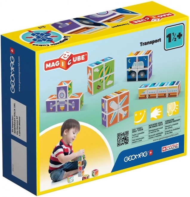 GEOMAG Magicube Printed Transport ist ein cleveres magnetisches Bauset, das Spielen und Lernen vereint. Vier bedruckte Würfel mit Transportmotiven und drei zweiseitige Karten laden Kinder dazu ein, Autos, Flugzeuge, Raketen und weitere Bilder zusammenzusetzen. Dank der Magnete, die an jeder Kante wirken, ist das Bauen intuitiv und sicher.