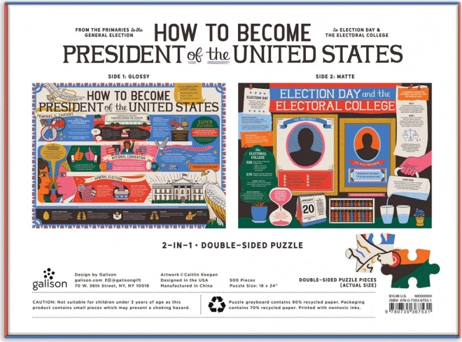 Dieses beidseitige Puzzle der Marke GALISON bietet doppelten Spaß. Eine Seite ist glänzend, die andere matt – das erleichtert die Unterscheidung der Motive und erhöht den Komfort beim Puzzeln. Das Thema führt Sie durch die Meilensteine der US-Präsidentschaftswahlen – von den Vorwahlen über die Nominierungen bis zur finalen Wahl.