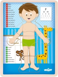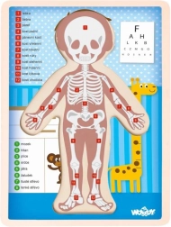 Woody doppelseitiges Puzzle Menschlicher Körper - Junge ist ein pädagogisches Spielzeug, das Kindern hilft, den menschlichen Körper und seine Organe kennenzulernen. Es enthält zwölf Teile mit der Bezeichnung der Organe und Knochen der menschlichen Anatomie.