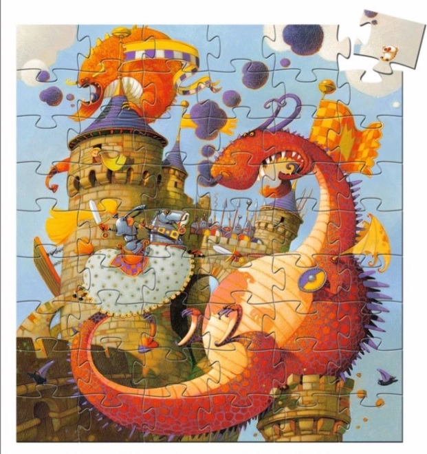 Puzzle mit Motiv eines Kampfes zwischen Ritter und Drache in einer schön geformten Schachtel. Größe des zusammengesetzten Puzzles ca. 37 × 40 cm