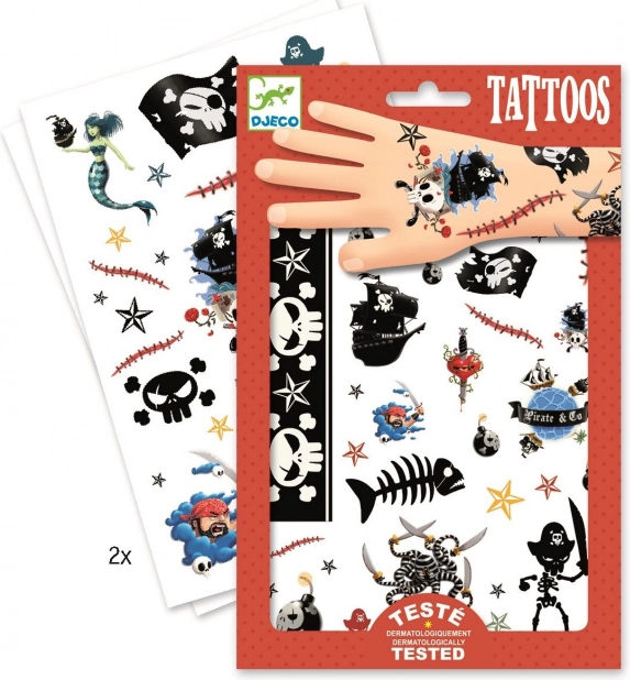 Begeben Sie sich auf ein Abenteuer auf hoher See mit den temporären DJECO-Tattoos im Piraten-Design. Feine Illustrationen, kräftige Farben und witzige Motive erfreuen Kinder und Eltern – ob für die Geburtstagsparty, den Karneval oder als kleine Belohnung.