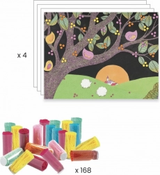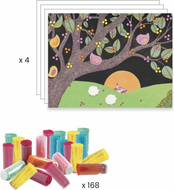 Dieses verspielte Set von DJECO bringt Kindern Freude am Gestalten und eine schöne Wanddekoration. Die Quästchen befinden sich in praktischen Röhrchen mit Klebepunkt – einfach auf die markierte Stelle auflegen, die Hülle abziehen und das freigesetzte Bündel aus Garn erzeugt einen reichen, fransigen Effekt. Nach Anleitung oder eigener Fantasie entstehen originelle 3D-Bilder.