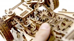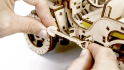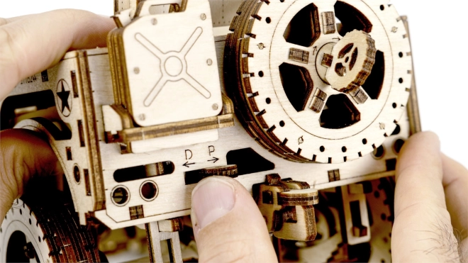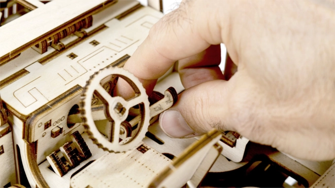 Jedes Teil des Modells, das etwa 27,9 x 15,1 x 14,8 cm misst, ist präzise mit einem Laser ausgeschnitten, um eine exakte und reibungslose Montage zu gewährleisten. Abschließend bereiten Sie Wachs zur Sicherstellung des reibungslosen Betriebs der Zahnräder und Achsen vor. Der Zusammenbau ist mit einem Abbrechmesser, einer Schere, Schleifpapier und einer Kerze abzuschließen (Ausstattung nicht im Lieferumfang enthalten).