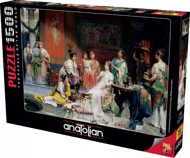 Entdecken Sie den Zauber des antiken Motivs mit dem Puzzle ANATOLIAN – Toilette einer römischen Dame. Das Zusammensetzen von 1500 Teilen stellt eine angenehme Herausforderung für Fortgeschrittene sowie geduldige Einsteiger dar und ergibt nach Fertigstellung ein beeindruckendes Bild mit den Maßen ca. 85 × 60 cm – ideal zum Einrahmen.
