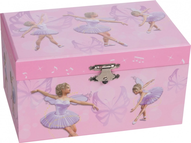 Die bezaubernde Spieluhr-Schmuckschatulle mit Schmetterlingsmotiv bringt eine poetische Ballettatmosphäre ins Kinderzimmer. Beim Öffnen erklingt die zarte Melodie Schwanensee und die kleine Ballerina beginnt sich vor ihrem Spiegel zu drehen – der perfekte Ort, um kleine Schätze und die ersten Schmuckstücke aufzubewahren.