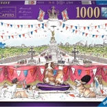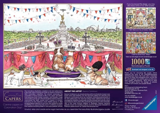Das beeindruckende Puzzle „Coronation Capers“ ermöglicht es, britische königliche Tradition bequem von zu Hause aus zu erleben. Das Werk der Künstlerin Eleanor Tomlinson ist detailreich und zeigt King Charles Cavaliers, Jack-Russell-Terrier, Corgis und weitere Elemente rund um die Krönung.