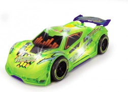 Das Auto verfügt über leuchtende Lichter und rhythmische Musik, die jede Fahrt begleiten.