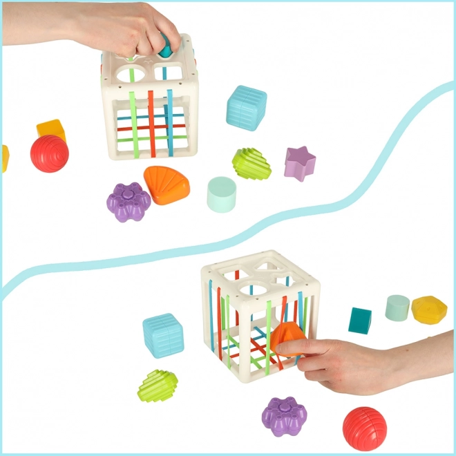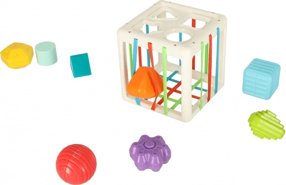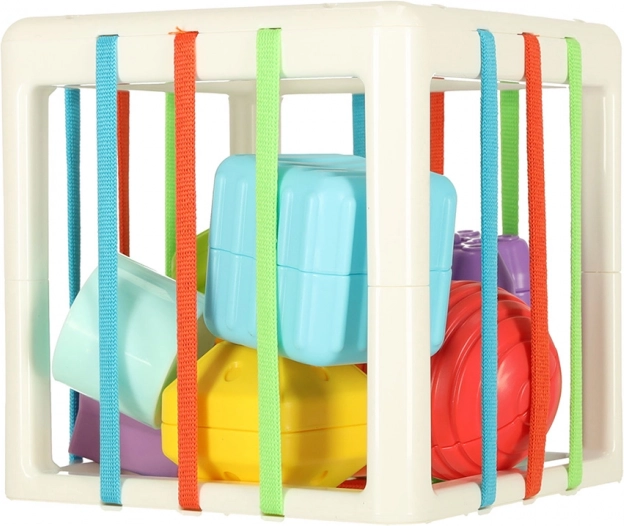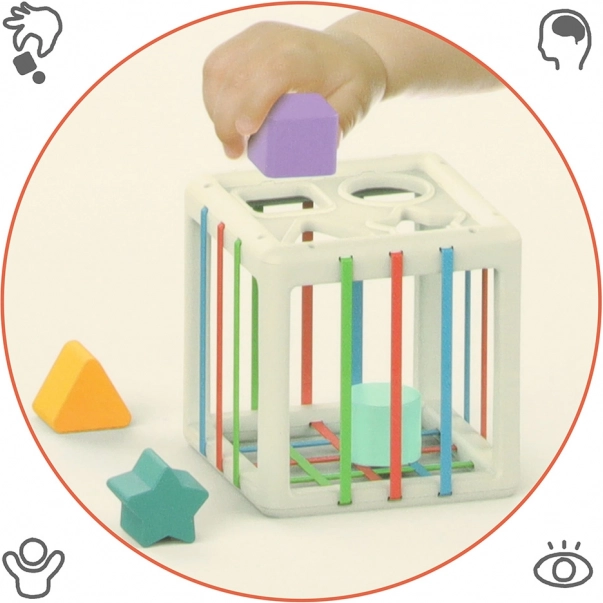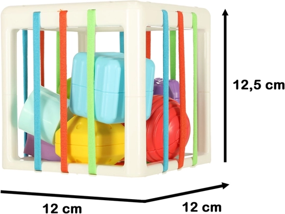 Der Kontakt mit den elastischen Elementen unterstützt die Entwicklung manueller Fähigkeiten, Kraft und Hand-Auge-Koordination. Sichere Materialien gewährleisten, dass der Würfel auch für die Kleinsten geeignet ist.