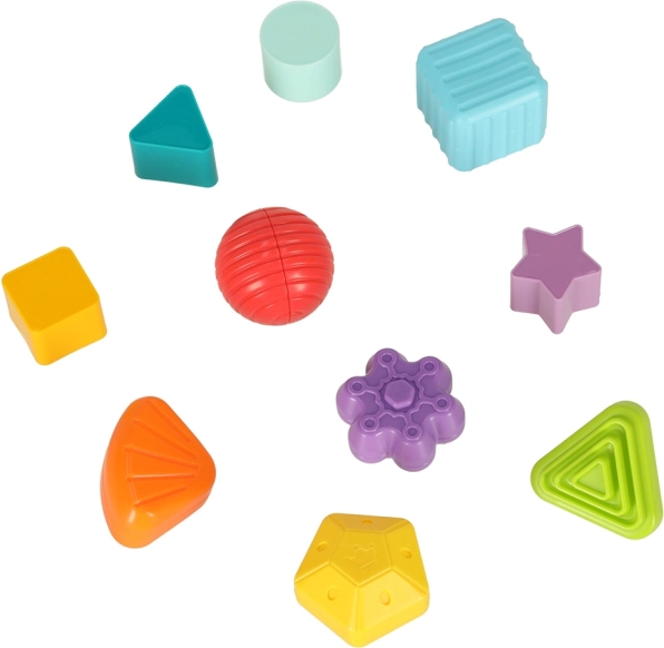 Dank der auffälligen Farben und vielfältigen Formen wird dieses Spielzeug jedes Kind begeistern und beim Lernen von Farberkennung und Formerkennung helfen. Jeder Block hat eine einzigartige Textur zur Stimulierung der Feinmotorik des Kindes.