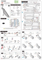 Der Zusammenbau erfolgt aus Stahlblechen (21 × 11 cm) mittels cleverer Verriegelungen – ganz ohne Klebstoff. Einfach die Teile herauslösen, in die vorgesehenen Schlitze stecken und die Laschen mit einer Zange umbiegen. Die Verpackung enthält 3 große und 1 kleines Stahlblech sowie eine übersichtliche Anleitung; empfohlen werden eine kleine Zange und ein Seitenschneider.