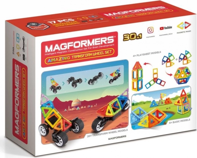Eines der speziellen Fahrgestelle ist mit massiven Rädern ausgestattet, die sich unabhängig voneinander bis zu 90° drehen lassen, sodass es sich sowohl für einspurige als auch zweispurige Fahrzeugmodelle eignet. Das zweite Fahrgestell ist eine klassische Achse mit zwei verbundenen Rädern; hier können drei unterschiedliche Höhenpositionen der Verbindungsplatte eingestellt werden – ideal für wagemutige Karosserien von Quads und Buggys. In Kombination mit beliebigen weiteren Magformers-Teilen wachsen Vielfalt und Größe der Fahrzeuge um ein Vielfaches. Die meisten der hunderten aus diesem Set gebauten Autos und Motorräder sind überraschend robust und können daher problemlos auch als funktionsfähige Spielzeuge eingesetzt werden. Geeignet für Kinder ab 3 Jahren.