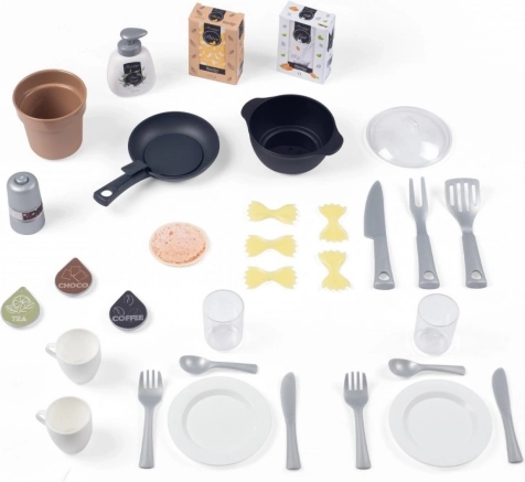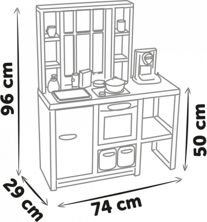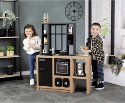 Die SMOBY Loft Küche im industriellen Stil fügt sich perfekt in moderne Interieurs ein und bietet Kindern einen sicheren Raum, um echtes Kochen nachzuspielen. Drehknöpfe, zu öffnende Türen und praktische Fächer fördern Rollenspiel, Selbstständigkeit und soziale Interaktion.