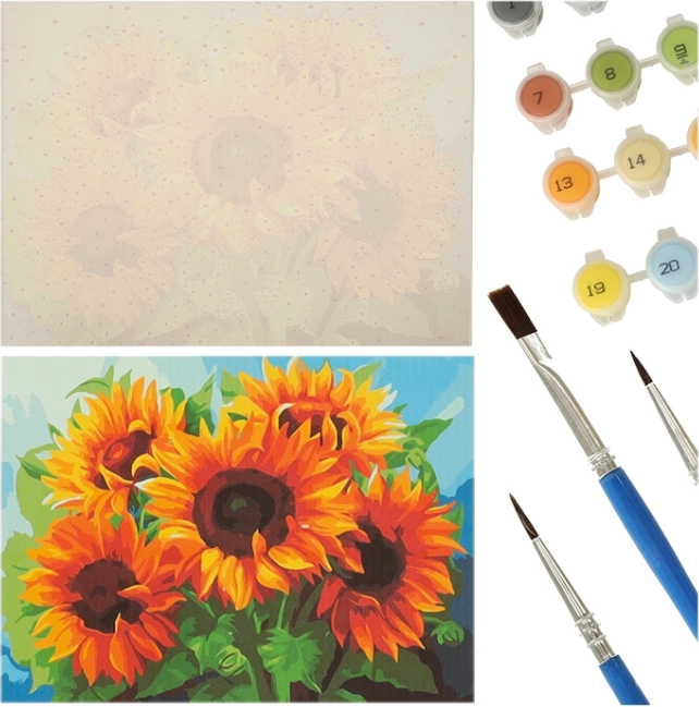Erleben Sie die Freude am Malen mit dem Malen nach Zahlen Sonnenblumen Bild in der Größe von 50x40 cm. Dieses Set bietet ein kreatives und entspannendes Erlebnis sowohl für Kinder als auch für Erwachsene.
