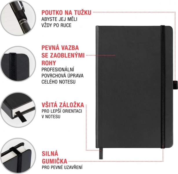 Liniert Seiten mit Textillesezeichen und elastischem Gummiband für schnellen Zugriff und sicheres Verschließen.