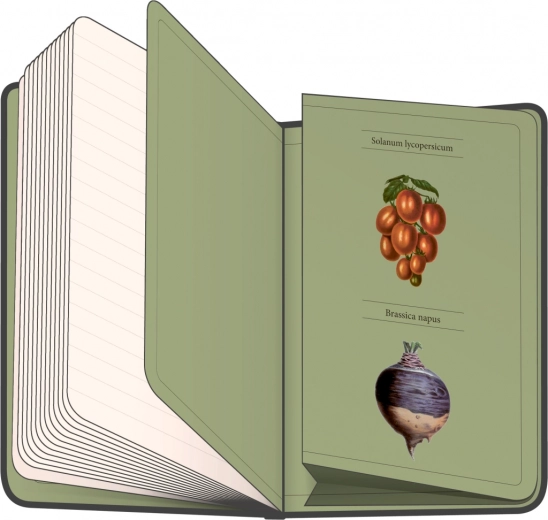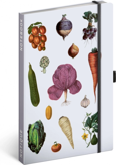 Notizbuch mit festem Einband aus der Kollektion von Kateřina Winterová mit Illustrationen verschiedener Gemüsesorten, mit Gummibandverschluss, Tasche für Kleinigkeiten und Stiftschlaufe. Innen finden Sie 172 linierte Seiten auf gelbem Papier zum Festhalten all Ihrer Ideen.