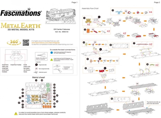 Entnehmen Sie die einzelnen Teile aus den Metallblechen; bei Bedarf verwenden Sie einen kleinen Seitenschneider (nicht enthalten). Die Teile werden mittels Laschen‑Schloss‑Verbindungen zusammengefügt, bestehend aus einer Lasche (Haken) und einer Öffnung. Biegen Sie die Lasche mit einer kleinen, spitzen Zange (nicht enthalten) um und fügen Sie nach und nach alle Verbindungen zusammen, bis ein sehr realistisches Meisterstück entsteht!