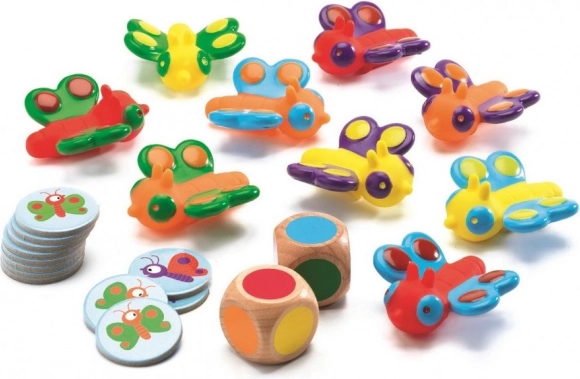 Dieses einfache und fesselnde Spiel fördert bei Kindern das Farbbewusstsein und die Konzentrationsfähigkeit. Ein Spieler wirft zwei Farbwürfel und sucht schnell den Schmetterling, der beide angezeigten Farben enthält. Wer ihn als Erster schnappt, erhält einen Gewinnchip. Ideal für das gemeinsame Spielen in der Familie und in Kindergärten.
