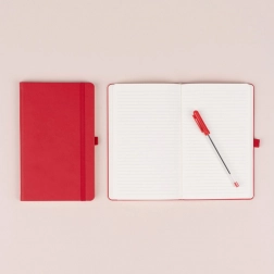 Der robuste rote Einband mit griffiger Struktur schützt Ihre Notizen, und das Gummiband hält alles auch unterwegs sicher geschlossen.