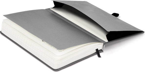 Textiles Lesezeichen für den schnellen Rückgriff auf wichtige Seiten und Innentasche für lose Zettel oder Visitenkarten.