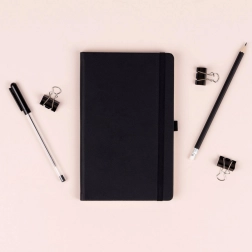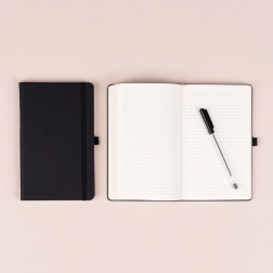 Elegantes liniertes Notizbuch in Schwarz mit den Maßen 13 × 21 cm bietet einen stabilen Bucheinband, ein elastisches Gummiband, eine Stiftschlaufe und ein Textillesezeichen. Hochwertiges gelbes Papier mit 6-mm-Linierung ist ideal für tägliches Schreiben, Planen und Notizen. Die Oberfläche mit gröberer Struktur ermöglicht Logo-Prägung und macht das Notizbuch auch als Firmengeschenk hervorragend geeignet.