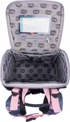 Das Klappöffnungssystem ermöglicht schnellen Zugriff auf Bücher direkt von der Schulbank. Innen gibt es eine transparente Tasche mit Stundenplan und einen Organizer mit Gummiband für eine gleichmäßige Gewichtsverteilung.