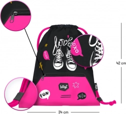 Dieser Beutel bietet ein einfaches und stilvolles Design in einer beliebten schwarz-rosafarbenen Kombination mit verspielten grafischen Elementen. Dank des praktischen Reißverschlussfachs im unteren Bereich lassen sich kleine Gegenstände sicher verstauen. Das funktionale Zuziehen mittels fester Kordeln erlaubt zugleich ein bequemes Tragen auf dem Rücken.