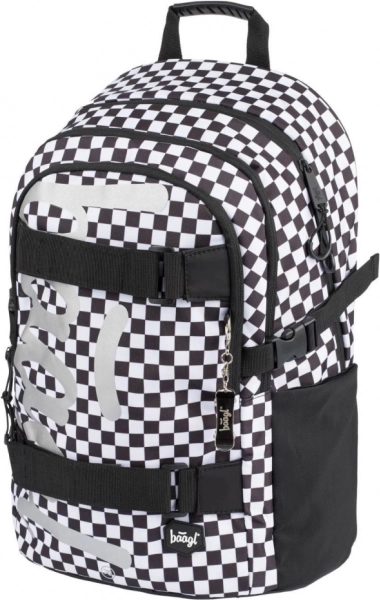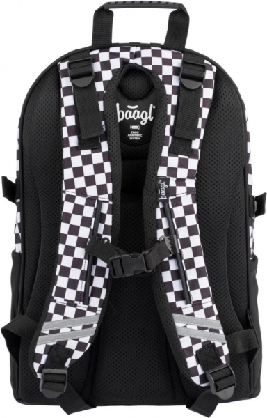 Schwarz‑weißes Schachbrettmuster mit reflektierenden Elementen für Sicherheit sowie ein zusätzlicher Metallanhänger.
