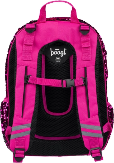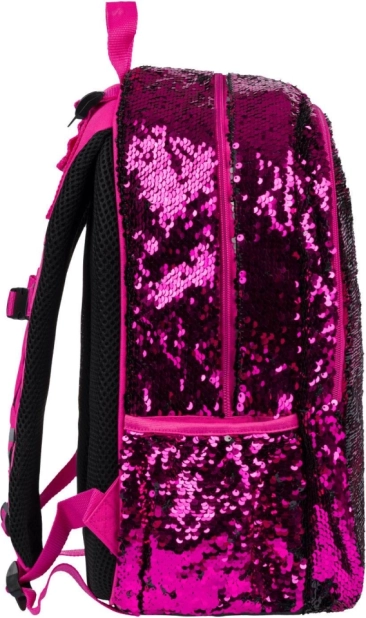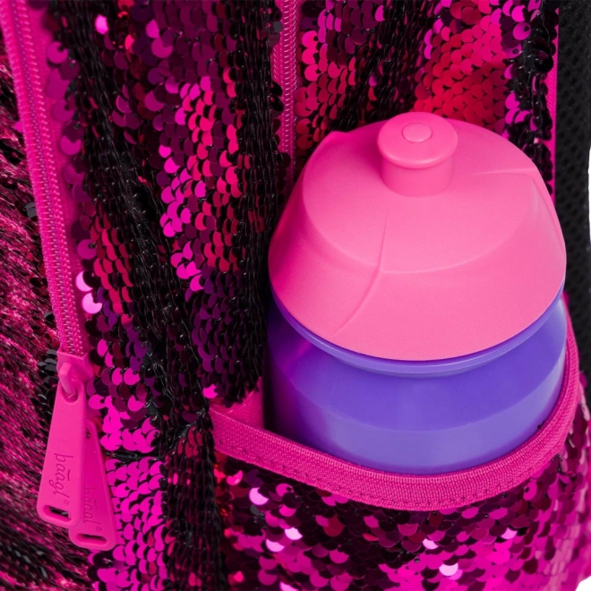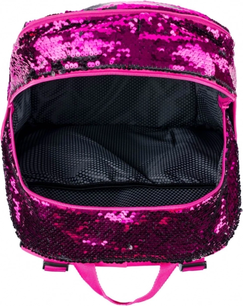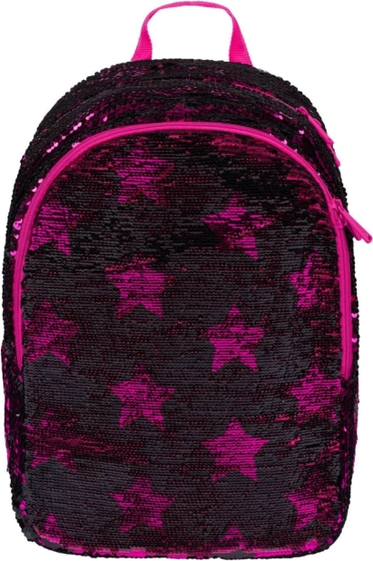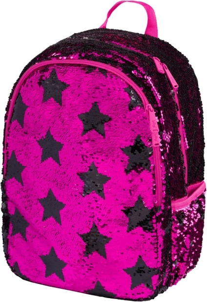 Rosa Pailletten und schwarze Sternenmuster verleihen dem Rucksack einen auffälligen Stil, ideal für Kinder, die aus der Menge herausragen möchten.