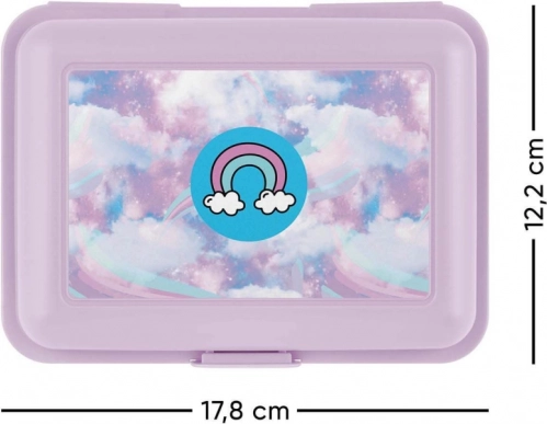 Die lila Box mit Himmelsmotiv ist der perfekte Begleiter für den täglichen Bedarf beim Verpacken von Mahlzeiten. Das stylische Design mit Wolken- und Regenbogenmotiven macht die Box geeignet für Kinder oder jeden, der verspielte Muster schätzt. Die Box besteht aus strapazierfähigem Kunststoff und bietet einen sicheren Verschluss.