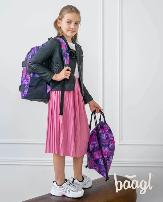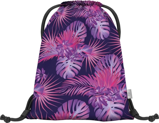 Der Beutel hat ein attraktives tropisches Motiv in Rosa- und Lilatönen, das die Aufmerksamkeit auf sich zieht.