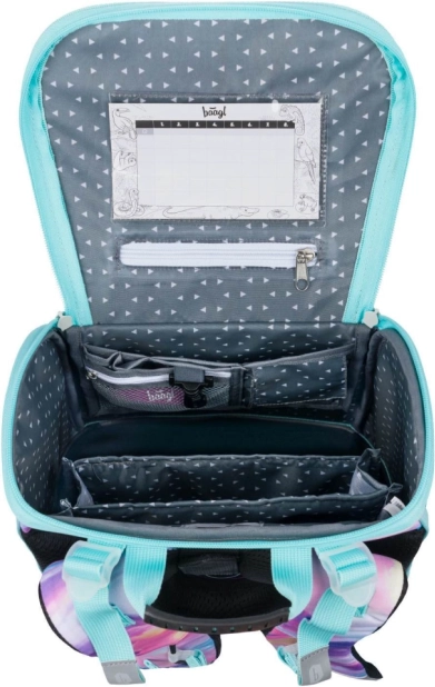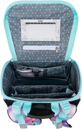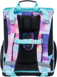 Der Ranzen zeichnet sich durch ein neues Klappsystem aus, das den Zugang zu Schulmaterialien direkt vom Tisch aus erleichtert. Innen finden Sie eine transparente Tasche mit Stundenplan, einen Innenorganizer mit Gummizug und seitliche Netztaschen, die sich für eine Trinkflasche eignen.