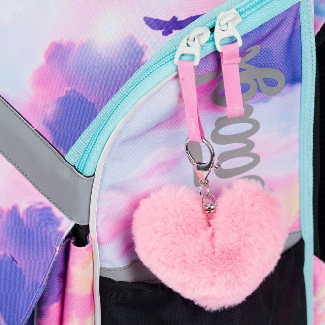 Weitere Merkmale sind die isolierte Vordertasche mit Schnalle, die leichte Konstruktion mit einem Gewicht von 1.100 g und einem Volumen von 18 l. Der Ranzen besteht aus wasserabweisendem Material und steht dank des festen Bodens selbstständig. Für die Sicherheit des Kindes sind reflektierende Elemente vorhanden und ein trendiger Plüschanhänger ist ebenfalls im Lieferumfang enthalten.
