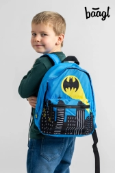 Kinder Rucksack Baagl mit ikonischem Batman-Motiv, ideal für die kleinsten Schüler. Er bietet Komfort, Stil und Sicherheit dank reflektierender Elemente.