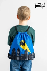 Der blaue Beutel ist mit dem ikonischen Batman-Logo und einem einzigartigen urbanen Motiv verziert.