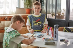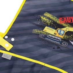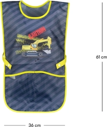 Der durchdachte Schnitt mit seitlichem Verschluss lässt sich bequem an die Figur anpassen. Zwei praktische Taschen im unteren Bereich bieten Platz für Pinsel, Stifte oder kleines Werkzeug. Das moderne grau-gelbe Design mit auffälligem Bagger begeistert Kinder und sorgt zugleich für gute Wiedererkennbarkeit in der Klasse.
