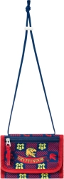 Federmäppchen mit zwei Klappen, Beutel für Hausschuhe mit vorderer Reißverschlusstasche, Heftmappe und Halsgeldbörse – alles in den Farben und mit dem Wappen von Gryffindor.