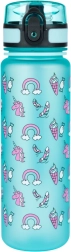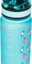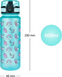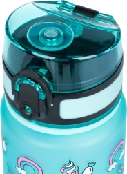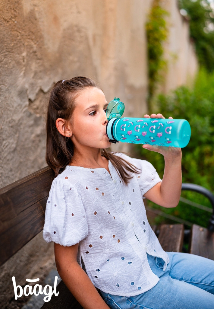 Diese Kinderflasche mit 500 ml Volumen kombiniert sicheres Tritan-Material mit einem verspielten Design aus Einhörnern, Regenbögen und Lutschern. Dank des Flip-Deckels mit Verriegelung ist sie auslaufsicher im Rucksack und die praktische Schlaufe erleichtert das Tragen mit kleinen Händen. Innen befindet sich ein Sieb, das Obst oder Kräuter zurückhält – ideal für hausgemachte Limonaden und Tees.