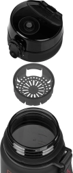 Der verriegelbare Deckel mit Sicherung verhindert ein unbeabsichtigtes Öffnen im Rucksack, und der Flip-Top-Mechanismus ermöglicht schnelles Trinken mit nur einer Hand. Das herausnehmbare Sieb eignet sich für Fruchtlimonaden oder losen Tee – das Material ist auch für heiße Getränke geeignet. Ein Trageband sorgt für komfortables Mitnehmen.
