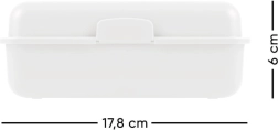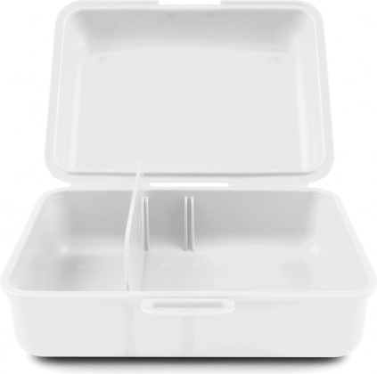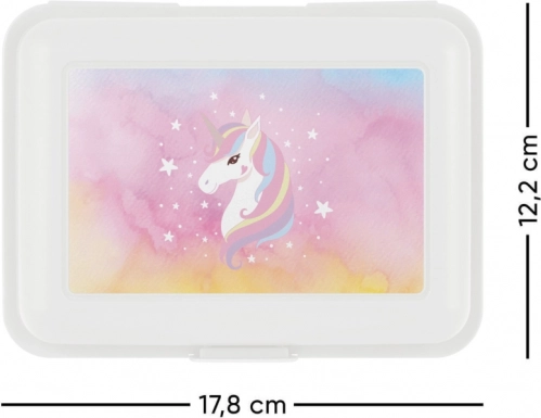 Weiße Plastikbox mit Einhorn in Pastellfarben auf dem Deckel, speziell für Kinder entworfen.