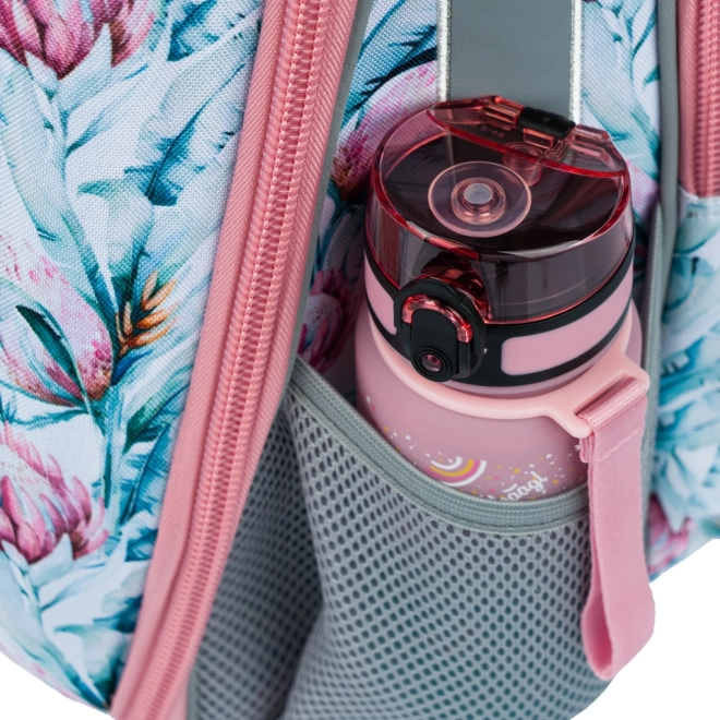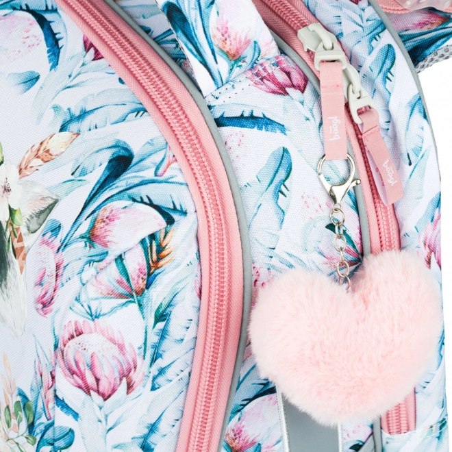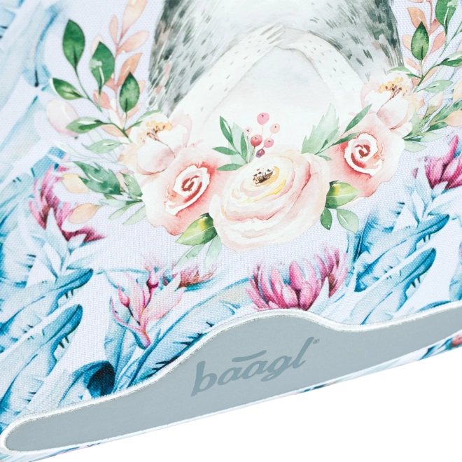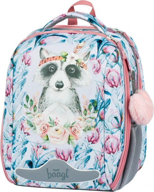 Der Ranzen hat ein farbiges Design mit einem Waschbär und Blumenmotiven, das kleine Schüler anspricht und ihnen täglich Freude bereitet.
