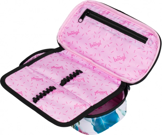 Das beliebte BAAGL-Etui im modernen Design tropischer Blätter ist die ideale Wahl für Schule und Freizeit. Dank der robusten Textilausführung und des hochwertigen Reißverschlusses bleiben alle Schreibutensilien sicher und übersichtlich verstaut. Die innere klappbare Trennwand mit elastischen Schlaufen ermöglicht schnellen Zugriff auf Stifte, während die Reißverschlusstasche Kleinigkeiten wie Radiergummis oder Anspitzer aufnimmt.