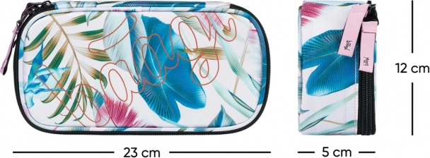 Zum Innenraum gehört außerdem eine transparente Tasche für den Stundenplan, damit Sie Ihren Schultag stets im Blick haben. Das Etui wird ohne Inhalt geliefert, sodass Sie es genau nach Ihren Bedürfnissen bestücken können. Das strapazierfähige Material und das zeitlose Aussehen mit tropischem Print eignen sich hervorragend für den täglichen Gebrauch.