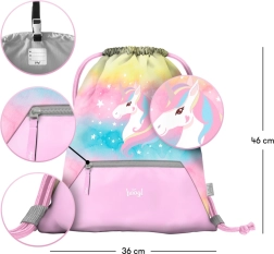 Praktischer und stylischer BAAGL-Beutel mit Rainbow-Unicorn-Motiv – ideal für Hausschuhe, Sportunterricht und Freizeitaktivitäten. Er bietet ein robustes, abwischbares Material, eine praktische Reißverschlusstasche und bequemes Tragen auf dem Rücken dank stabiler Kordeln. Mit der Karabinerbefestigung lässt er sich leicht an der Schultasche anclippen.